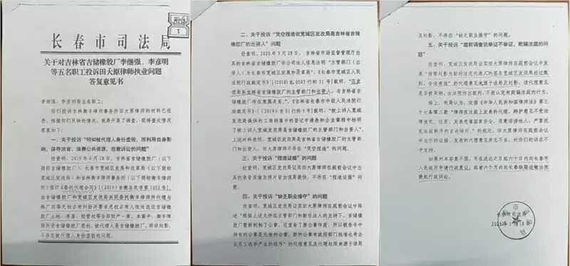 与此同时,职工们针对长春市司法局及王承伟局长涉嫌包庇田大原律师的行为,已经向吉林省司法厅等具有管理权限的机关提交了《关于长春市司法局及局长王承伟履职问题的举报材料》;向吉林省司法厅、长春市政法委等具有管理权限机关提交了《关于严厉督促长春市司法局依法履行答复职责的投诉函》。