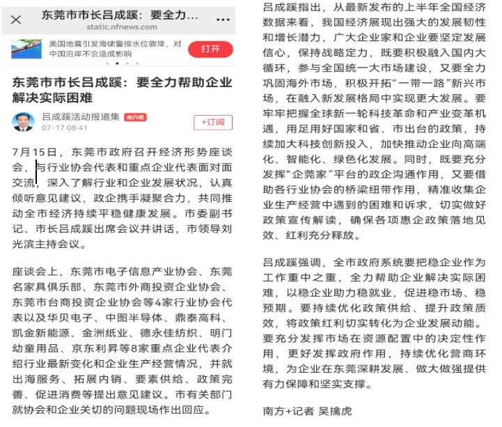 7月4日,南方+报道了《东莞市市长吕成蹊:以高效服务推动项目早落地早动工早投产》;7月2日,东莞市委副书记、市长吕成蹊主持召开市政府常务会议,研究东莞经济运行、资源环境要素市场化、高校配套设施建设等工作。